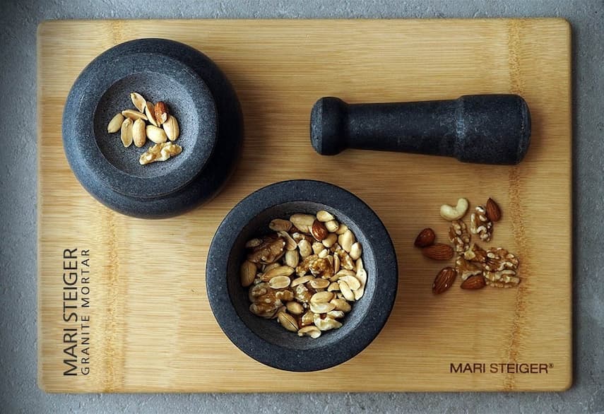 Cối và chày của Mari Steiger đều được làm bằng đá Granite đã được mài khá mịn ở bên trong và hơi nhám bên ngoài, màu sắc của chất liệu khá là tươi, nhưng sau vài lần sử dụng sẽ có màu đậm dần nhưng vẫn vô cùng bền bỉ, chất liệu đá của chày cũng giúp nghiền nguyên liệu cực hiệu quả. Tấm lót silicone Maristeiger ở bên dưới giúp việc sử dụng được dễ dàng hơn, tránh việc bị xê dịch khi đang chế biến.