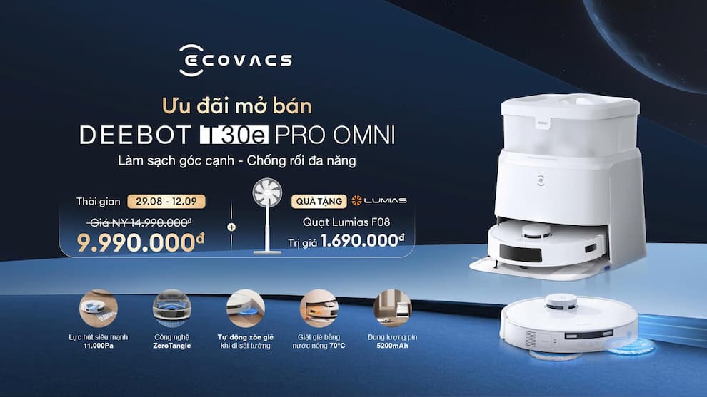 -19%Bạn có biết, những góc khuất trong nhà chính là “thiên đường” cho bụi bẩn và vi khuẩn trú ngụ? Đừng lo, đã có Deebot T30e Pro Omni với công nghệ lau TruEdge Adaptive Edge Mopping “thần thánh”. Chuyên gia dọn dẹp nhà cửa - Deebot T30e Pro Omni sở hữu lực hút cực mạnh 11.000 Pa, robot không chỉ “nuốt gọn” mọi hạt bụi mà còn khéo léo len lỏi vào từng ngóc ngách, làm sạch từng milimet nhờ hệ thống lau cạnh thông minh có thể tự điều chỉnh linh hoạt. Kể cả những góc tường khó nhằn nhất cũng phải chịu thua! Robot hút bụi lau nhà Ecovacs Deebot T30e Pro Omni là một trong những sản phẩm cao cấp của Ecovacs, được trang bị nhiều công nghệ tiên tiến để mang lại hiệu quả làm sạch vượt trội và trải nghiệm tiện lợi cho người dùng. Dưới đây là những điểm nổi bật của robot này: