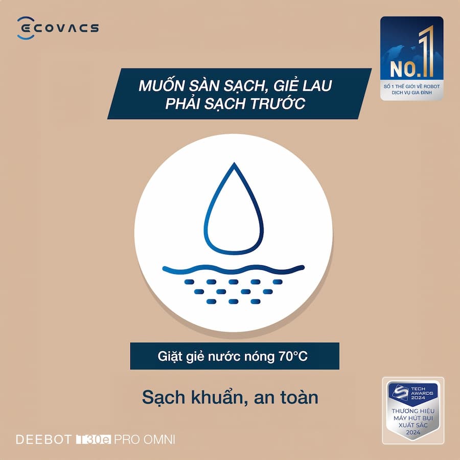 Giặt giẻ bằng nước nóng 70°C: Trạm sạc tự động giặt giẻ lau bằng nước nóng, giúp loại bỏ hiệu quả các vết bẩn cứng đầu, vi khuẩn và mùi hôi, đảm bảo sàn nhà luôn sạch sẽ và hợp vệ sinh.