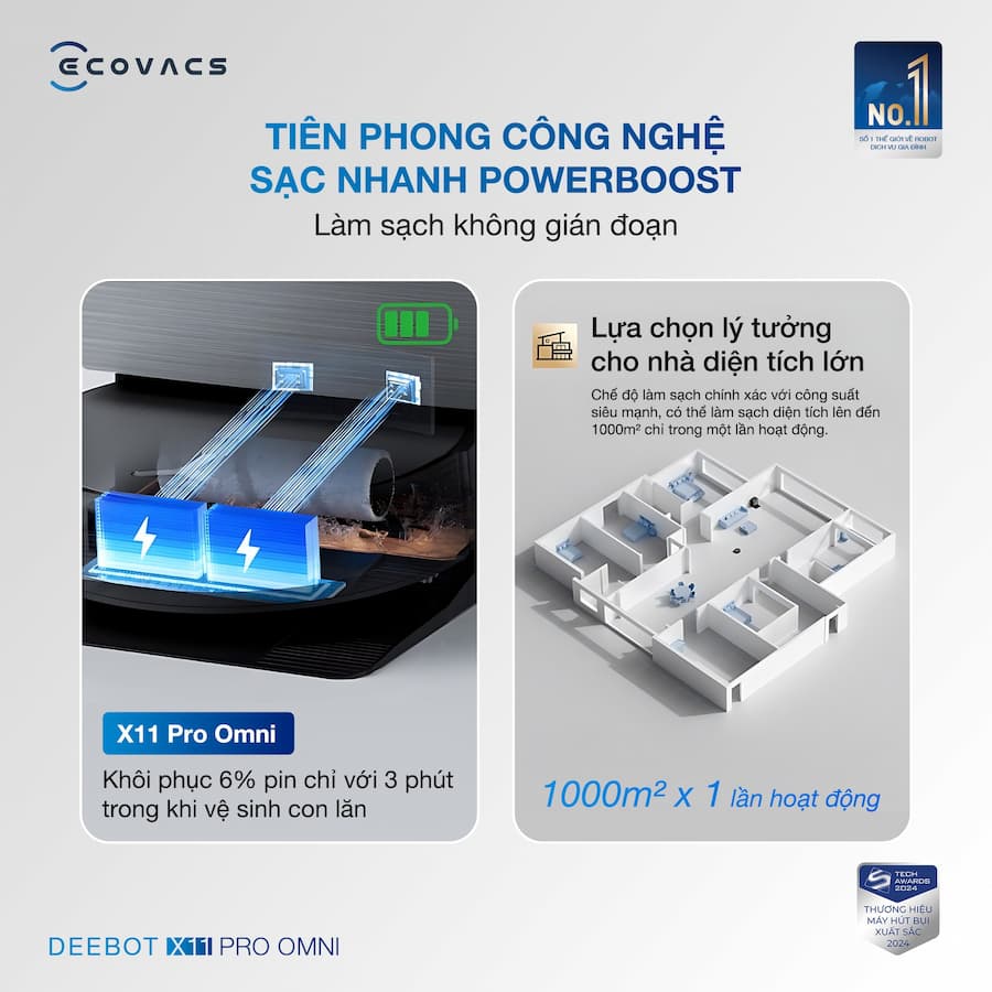Sạc siêu nhanh PowerBoost: Công nghệ độc quyền cho phép robot sạc nhanh 6% pin chỉ trong 3 phút khi quay về trạm để giặt giẻ. Nhờ đó, robot có thể hoạt động liên tục, không bị gián đoạn, làm sạch diện tích lên tới 1000m².
