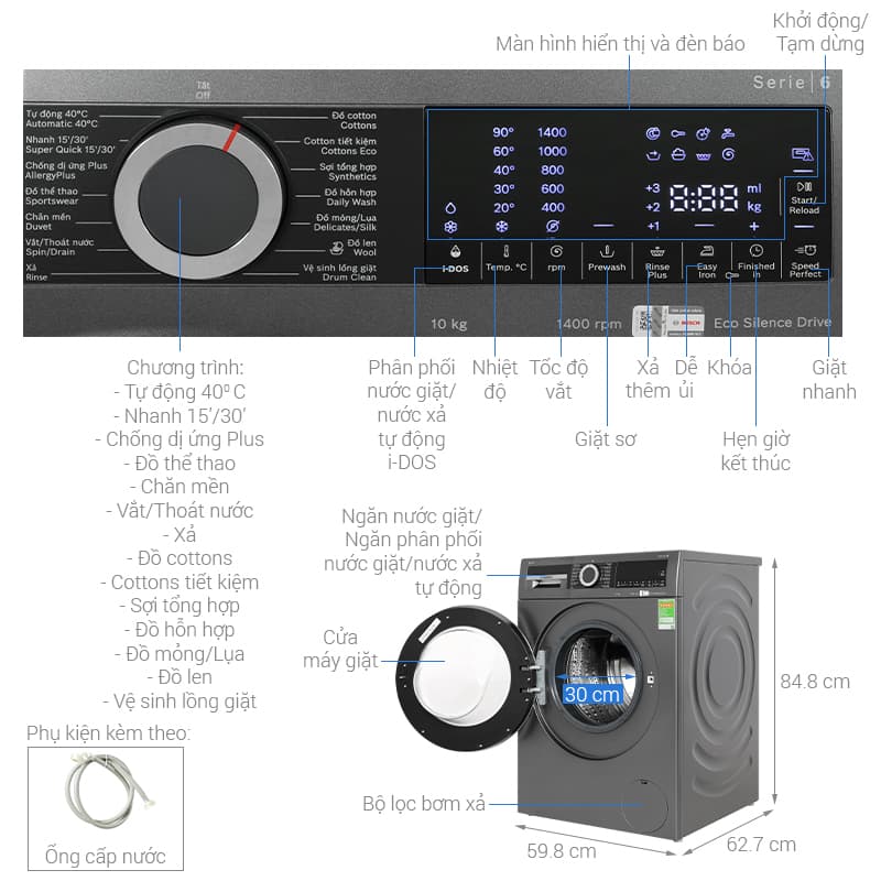 -36%MÁY GIẶT BOSCH SERIE 6 WGG254A0VN I-DOS 10KG là một mẫu máy giặt cửa trước (lồng ngang) hiện đại của Bosch, được thiết kế để mang lại hiệu quả giặt sạch vượt trội và tiết kiệm năng lượng. Hệ thống i-DOS tự động đo lường và phân bổ chính xác lượng nước giặt, nước xả cần thiết cho mỗi lần giặt, dựa trên khối lượng và độ bẩn của quần áo. Điều này giúp tránh lãng phí chất tẩy rửa và nước, đồng thời bảo vệ quần áo tốt hơn. Máy giặt Bosch WGG254A0VN được trang bị nhiều chương trình giặt khác nhau, bao gồm các chế độ giặt nhanh, giặt diệt khuẩn (AllergyPlus), giặt sơ, giặt đồ len, đồ thể thao... để phù hợp với nhiều loại vải và nhu cầu sử dụng. Bảng điều khiển: Song ngữ Anh - Việt, có núm xoay, cảm ứng và màn hình LED hiển thị rõ ràng, giúp người dùng dễ dàng thao tác.