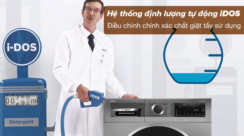 Đây là tính năng đáng giá nhất của máy giặt Bosch WGG254A0VN. Hệ thống i-DOS (Intelligent Dosing System) sử dụng cảm biến thông minh để tự động đo lường lượng nước giặt và nước xả cần thiết dựa trên khối lượng, độ bẩn của quần áo và loại vải.