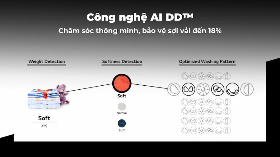 AI DD™ (Artificial Intelligence Direct Drive): Đây là công nghệ nổi bật nhất, sử dụng trí tuệ nhân tạo để nhận biết trọng lượng và độ mềm mại của sợi vải, từ đó tối ưu hóa các chuyển động giặt. Đây là công nghệ độc quyền của LG. Máy giặt sẽ sử dụng trí tuệ nhân tạo để cảm nhận trọng lượng và độ mềm của quần áo. Dựa trên dữ liệu này, máy sẽ tự động chọn chu trình giặt tối ưu nhất, giúp bảo vệ sợi vải tốt hơn đến 18% so với các dòng máy giặt thông thường. Điều này đặc biệt hữu ích với các loại quần áo có chất liệu tinh xảo.