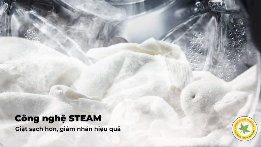 Giặt hơi nước Steam+™: Công nghệ giặt hơi nước của LG giúp diệt khuẩn, loại bỏ các tác nhân gây dị ứng trên quần áo một cách hiệu quả. Đây là một tính năng rất hữu ích, đặc biệt với những gia đình có trẻ nhỏ hoặc người có làn da nhạy cảm. Hơi nước nóng cũng giúp làm mềm vải và giảm nếp nhăn, giúp việc ủi quần áo sau đó trở nên dễ dàng hơn.