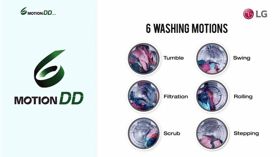 Công nghệ giặt 6 chuyển động (6 Motion DD): Mô phỏng các động tác giặt tay (nhào lộn, chà xát, đập, quay, đảo, nén) giúp quần áo được giặt sạch tối ưu và bảo vệ cấu trúc sợi vải.