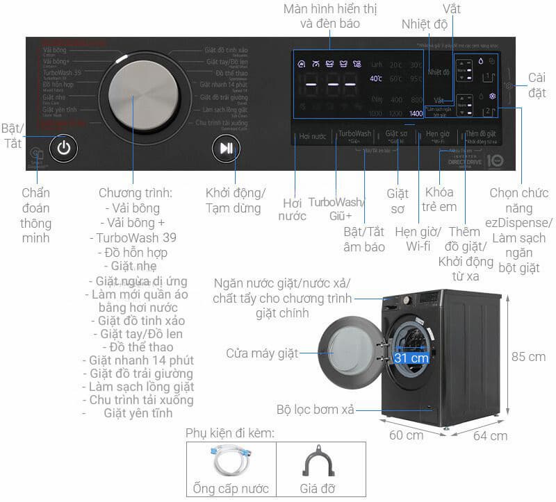 -45%Máy giặt lồng ngang LG AI DD™ Inverter 14kg màu đen FV1414S3BA là một sản phẩm máy giặt hiện đại với nhiều công nghệ tiên tiến, phù hợp cho các gia đình đông người (trên 7 thành viên) hoặc những gia đình có nhu cầu giặt giũ lớn. Lồng giặt rộng rãi cho phép giặt hiệu quả các vật dụng cồng kềnh như chăn màn hay áo lông, góp phần tiết kiệm đáng kể thời gian và công sức trong công việc giặt giũ hàng ngày. Máy giặt LG FV1414S3BA sở hữu "thiết kế thanh lịch" được mô tả là "hài hòa với không gian hiện đại" của gia đình. Các cải tiến về thiết kế bao gồm "màn hình hiển thị rõ ràng hơn" và "núm xoay có kích thước lớn hơn," giúp cải thiện tương tác người dùng và tổng thể thẩm mỹ. Sự đa dạng của 14 chương trình giặt, kết hợp với công nghệ AI DD và tích hợp ứng dụng LG ThinQ, làm nổi bật chiến lược của LG nhằm đáp ứng một loạt các loại vải và sở thích người dùng, đồng thời đơn giản hóa trải nghiệm tổng thể trên máy giặt LG AI DD Inverter 14 kg FV1414S3BA. Tính năng "Chu trình tải về" thông qua LG ThinQ là một khía cạnh đặc biệt tiên tiến, cho thấy chức năng của máy không cố định mà có thể phát triển và được cập nhật theo thời gian.