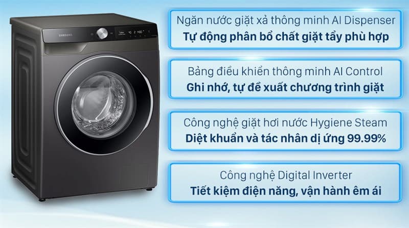 Máy ngoài ra còn được tích hợp một công nghệ giặt bằng hơi nước Hygiene Steam ở nhiệt độ cao sẽ trực tiếp phun từ dưới lên, giúp len lỏi qua những sợi vải để từ đó loại bỏ hoàn toàn những cặn bẩn và vi khuẩn bám sâu bên trong, cả các tác nhân gây dị ứng cũng bởi vậy sẽ được thổi bay hết, đảm bảo sức khỏe cho cả gia đình.