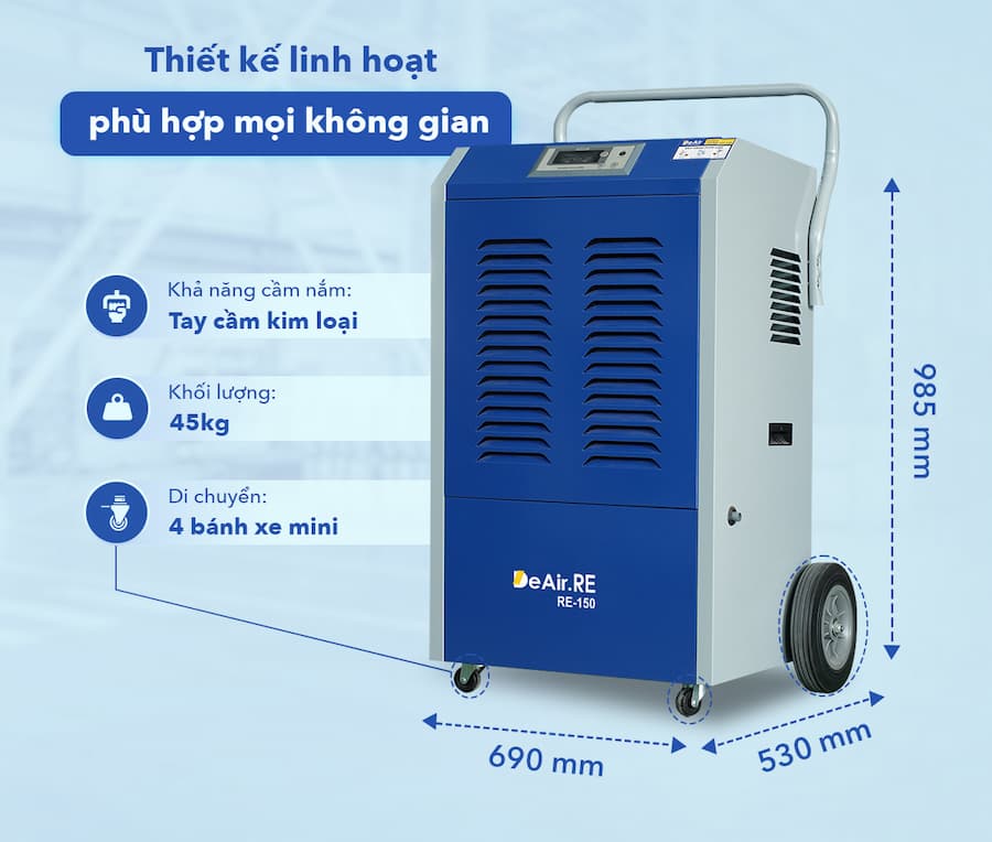 -23%Máy hút ẩm DeAir RE-150 - Giải pháp kiểm soát độ ẩm tối ưu cho không gian công nghiệp vừa và nhỏ. Trong môi trường sản xuất, kho bảo quản hay siêu thị mini, việc kiểm soát độ ẩm đóng vai trò then chốt để đảm bảo chất lượng sản phẩm, an toàn lao động, và hiệu quả sản xuất. Độ ẩm quá cao có thể gây ra nấm mốc, hư hỏng hàng hóa, ảnh hưởng đến sức khỏe người lao động, và làm giảm tuổi thọ máy móc thiết bị. Máy hút ẩm công nghiệp DeAir.RE-150 là giải pháp tối ưu giúp bạn giải quyết những vấn đề này. Dưới đây là một bản tóm tắt các thông số kỹ thuật và tính năng nổi bật của DeAir.RE-150: