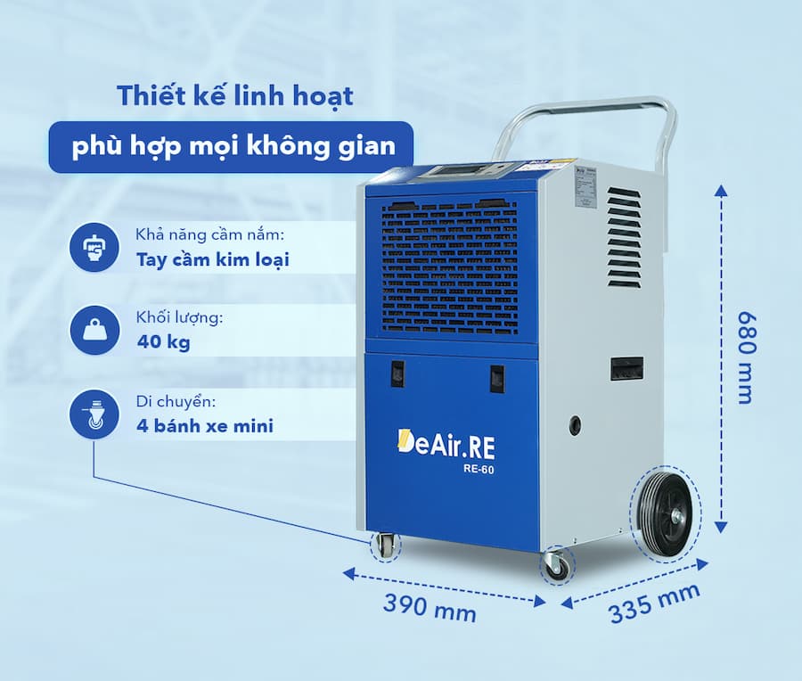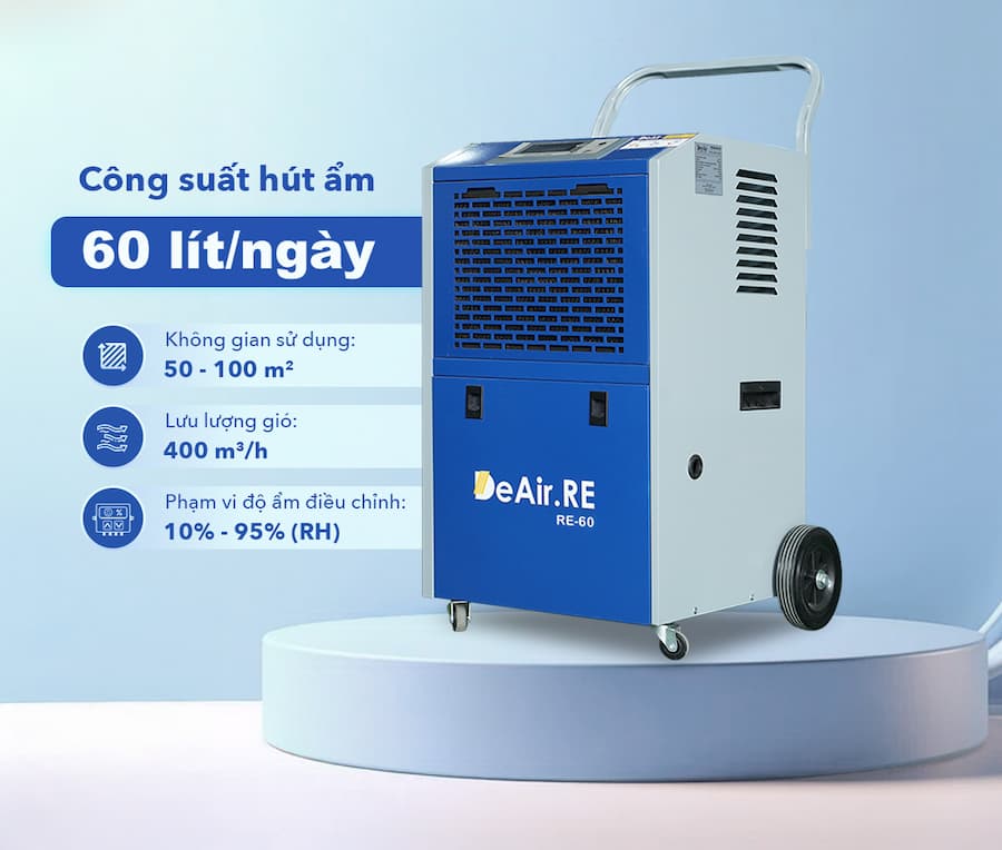 Trong môi trường sản xuất, kho bảo quản hay siêu thị mini, việc kiểm soát độ ẩm đóng vai trò then chốt để đảm bảo chất lượng sản phẩm, an toàn lao động, và hiệu quả sản xuất. Độ ẩm quá cao có thể gây ra nấm mốc, hư hỏng hàng hóa, ảnh hưởng đến sức khỏe người lao động, và làm giảm tuổi thọ máy móc thiết bị. Máy hút ẩm DeAir.RE-60 là giải pháp tối ưu giúp bạn giải quyết các vấn đề về kiểm soát độ ẩm công nghiệp.