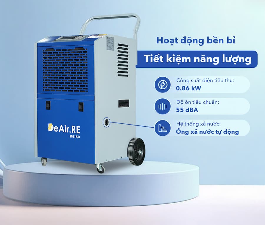 Hiệu suất và công suất hút ẩm tốt: Với công suất hút ẩm 60 lít/ngày, máy đáp ứng tốt nhu cầu kiểm soát độ ẩm cho nhiều không gian.