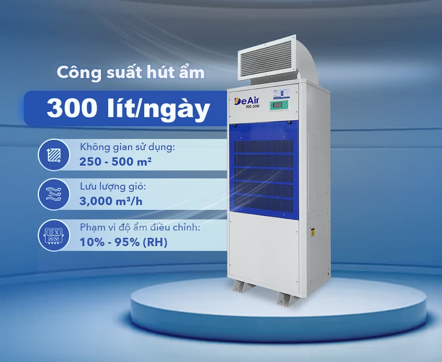 Công suất hút ẩm: 300 kg/ngày (tại điều kiện 30°C, 70% độ ẩm).
