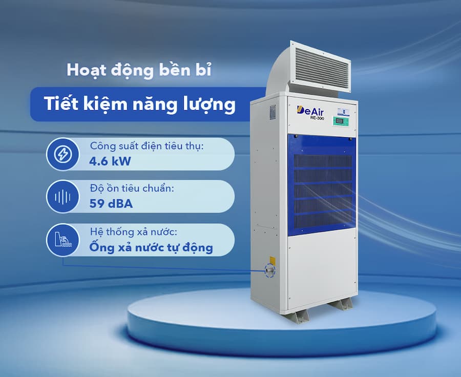Công nghệ Heat Pump tiên tiến: Đây là "trái tim" của giải pháp, cho phép máy tái sử dụng nhiệt thải, từ đó giảm đáng kể lượng điện năng tiêu thụ so với các phương pháp hút ẩm truyền thống. Lợi ích Máy hút ẩm Heat-Pump DeAir RE-300: Tiết kiệm chi phí vận hành, giảm phát thải carbon, hướng đến sản xuất "xanh".