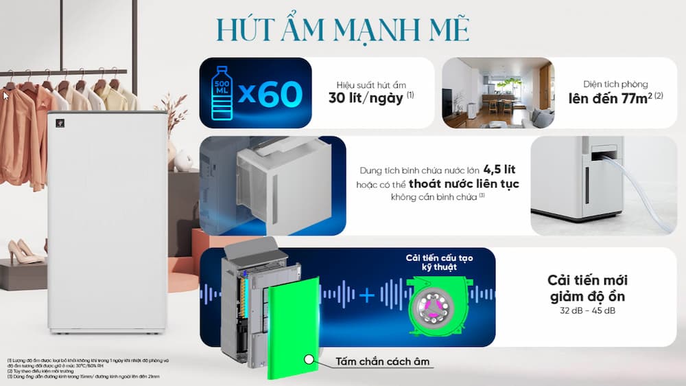 Công suất hút ẩm 30 lít/ngày (ở điều kiện 30°C/80%RH), phù hợp cho phòng có diện tích lên đến 77m².