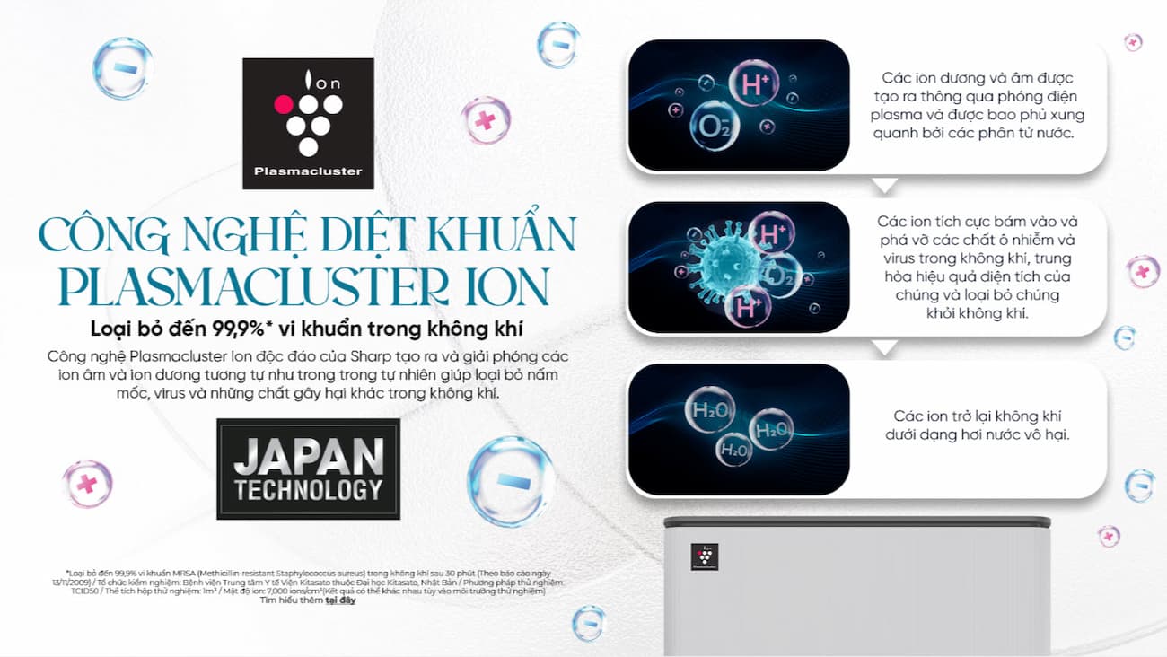 Công nghệ độc quyền của Sharp giúp tạo và phát tán các ion âm/dương, loại bỏ hiệu quả vi khuẩn, nấm mốc, và khử mùi hôi khó chịu trong không khí, bảo vệ sức khỏe.