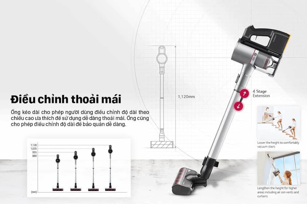 Thời gian sử dụng dài: Máy hút bụi cầm tay LG A9K-MAX sử dụng pin Lithium-ion cung cấp thời gian hoạt động dài hơn. Đầu phun Slim Power Drive ™ giúp hút bụi, bẩn và lông thú cưng khỏi không gian khó tiếp cận một cách hiệu quả.