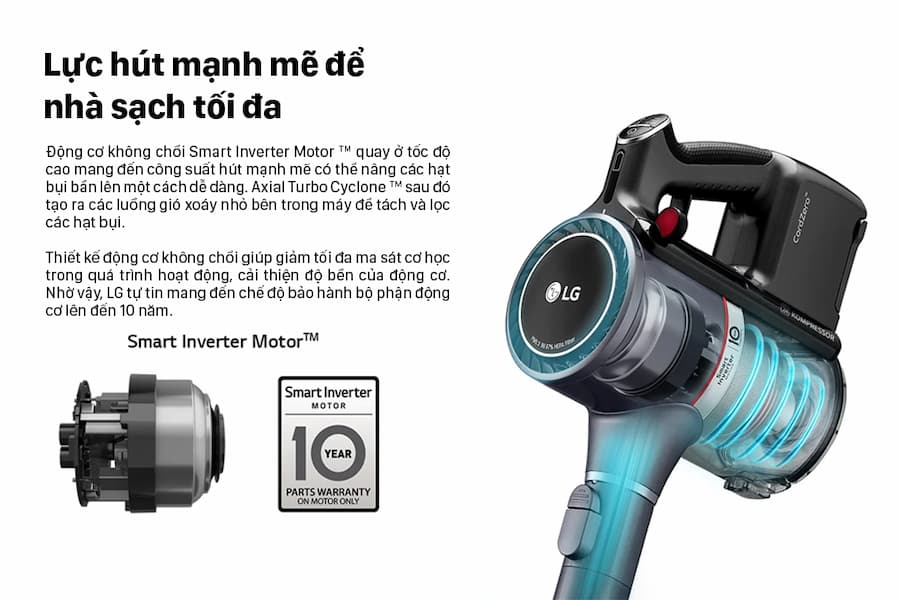 Lực hút mạnh mẽ: Kết hợp động cơ Smart Inverter Motor™ và công nghệ lốc xoáy Axial Turbo Cyclone.