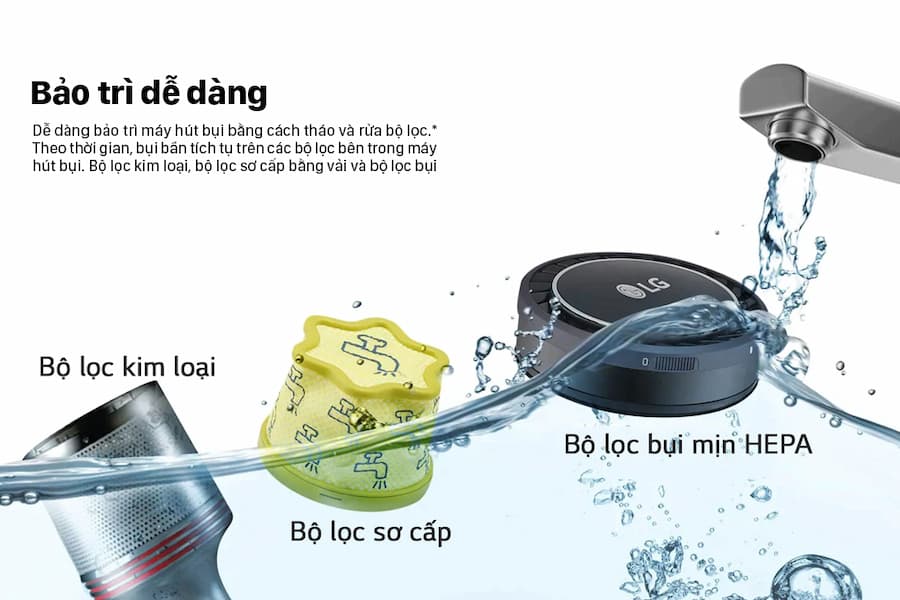 Đầu lọc dễ vệ sinh: Các bộ phận như bộ lọc, lồng hút có thể tháo rời và rửa sạch bằng nước. Đầu lọc dễ dàng tháo rời và rửa sạch. Bụi bẩn tích tụ trên các đầu lọc theo thời gian nằm trong máy hút bụi có thể được tháo rời và rửa sạch để loại bỏ hoàn toàn các chất bẩn như: Đầu lọc có lưới kim loại, đầu lọc vải sơ cấp và đầu lọc bụi mịn. Lưu ý, trước khi lắp đặt các đầu lọc trở lại vào thân máy, cần hong khô cẩn thận.