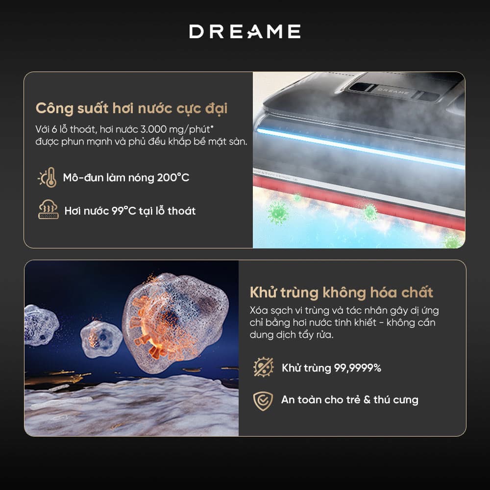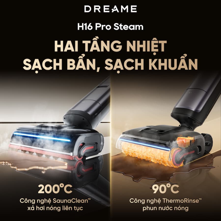 Bên cạnh hơi nước, chế độ ThermoRinse™ cung cấp dòng nước nóng 90°C trực tiếp lên cuộn lăn thông qua 57 cửa thoát nước độc đáo. Nước nóng ở nhiệt độ này là giải pháp tối ưu để hòa tan các loại dầu mỡ nhà bếp mà nước lạnh không thể xử lý triệt để, đồng thời ngăn chặn hiện tượng vệt nước nhờn dính sau khi lau. Hệ thống bơm kép (Air Pump & Water Pump) của Dreame H16 Pro Steam đảm bảo áp suất phun ổn định, giúp nước nóng len lỏi vào từng kẽ sàn và thu hồi bẩn vào bình chứa nước bẩn một cách hiệu quả.