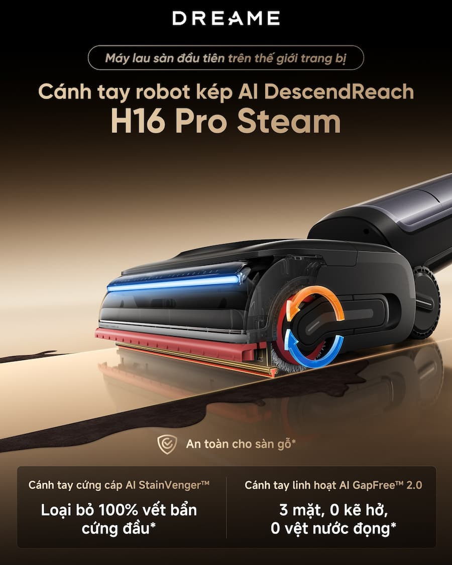 Sự khác biệt về khả năng tiếp cận không gian của Dreame H16 Pro Steam nằm ở công nghệ AI DescendReach với hệ thống cánh tay kép lần đầu tiên xuất hiện trên thế giới. Đây là giải pháp cho bài toán làm sạch sát mép tường và các góc hẹp mà máy hút bụi cầm tay truyền thống thường bỏ sót.