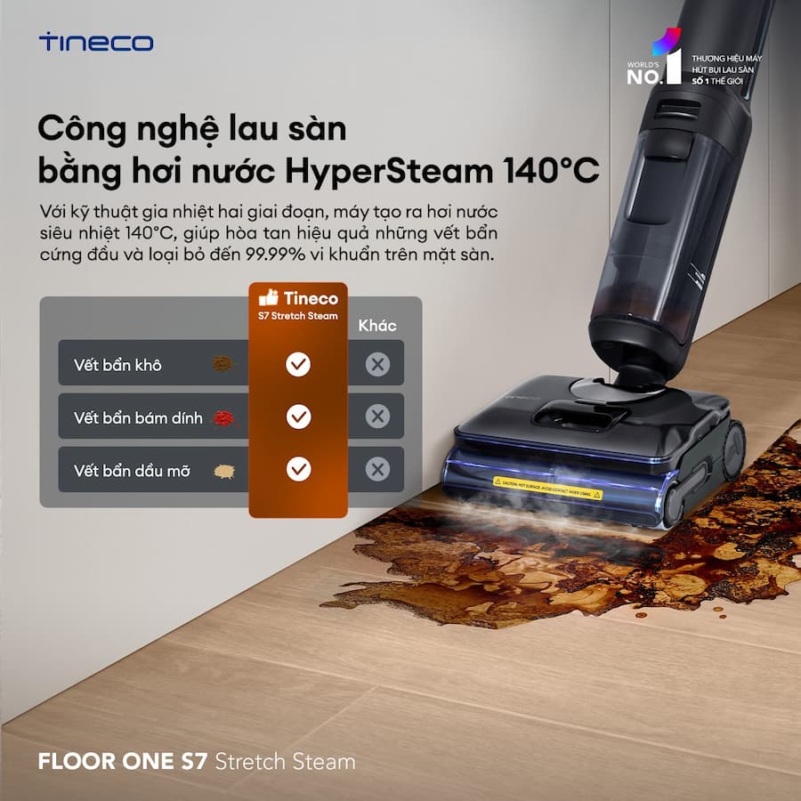 Lau bằng hơi nước nóng HyperSteam 140°C: Đây là điểm khác biệt lớn nhất của Tineco S7 Stretch Steam. Hơi nước nóng giúp làm tan các vết bẩn cứng đầu như dầu mỡ, vết cà phê khô, đồng thời diệt khuẩn và khử trùng sàn nhà một cách tự nhiên mà không cần dùng hóa chất. Điều này rất hữu ích cho các gia đình có trẻ nhỏ hoặc thú cưng.