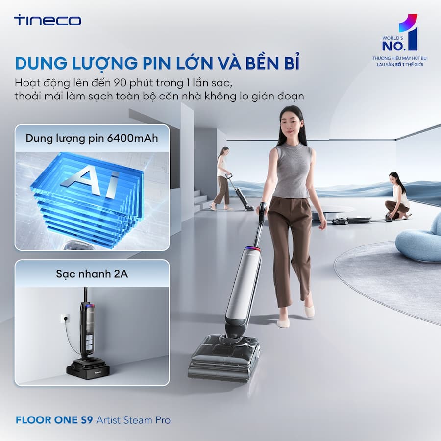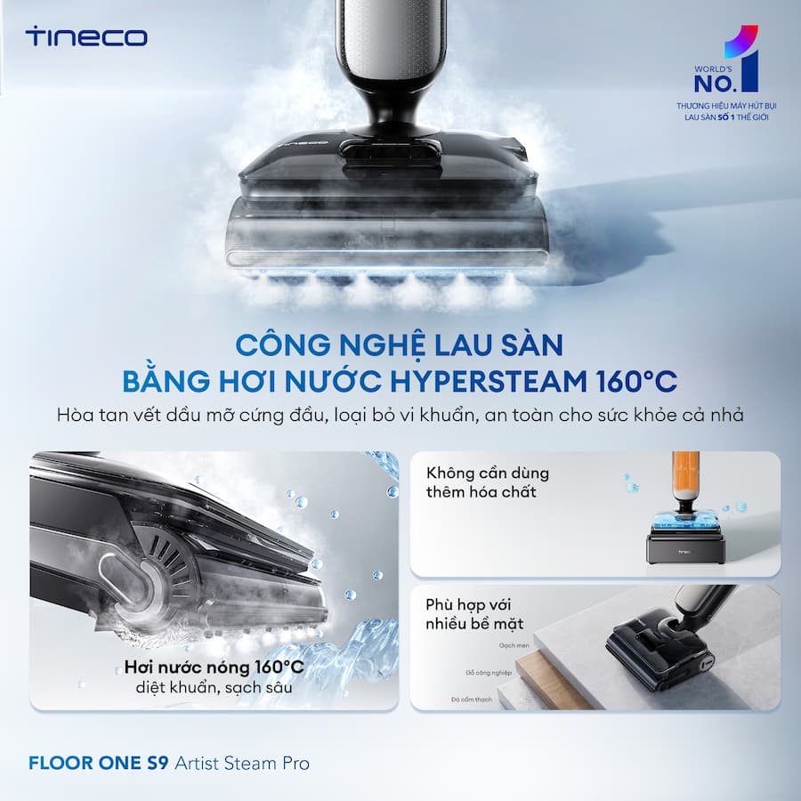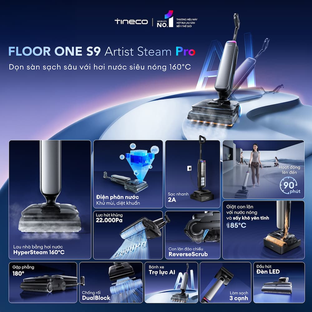 Nếu bạn tìm kiếm một chiếc máy hút bụi lau nhà không dây đa năng, có khả năng làm sạch sâu bằng hơi nước nóng để diệt khuẩn, và được trang bị các tính năng tự động hóa hàng đầu (như iLoop, FlashDry, HyperStretch) để giảm công sức dọn dẹp, thì Tineco Floor One S9 Artist Steam Pro là một lựa chọn rất đáng cân nhắc trong phân khúc cao cấp. Tineco S9 Artist Steam Pro với công nghệ hơi nước HyperSteam 160℃ đánh bay vết dầu mỡ, diệt 99.99% vi khuẩn, bảo vệ sức khỏe gia đình. Sàn sạch sâu - Diệt khuẩn nhanh - Giá hấp dẫn! Dưới đây là những lý do chính:
