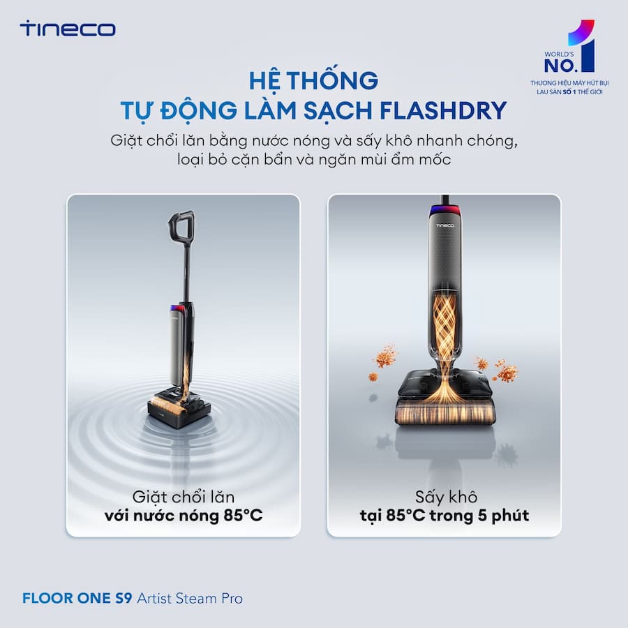 Tự động làm sạch và sấy khô FlashDry: Sau khi dọn dẹp, bạn chỉ cần đặt máy về trạm sạc và kích hoạt chế độ tự làm sạch. Máy hút bụi lau nhà Tineco Floor One S9 Artist Steam Pro sẽ rửa con lăn bằng nước sạch, sau đó sấy khô bằng khí nóng (85°C), giúp ngăn ngừa vi khuẩn, nấm mốc phát triển và loại bỏ mùi hôi trên chổi lau.