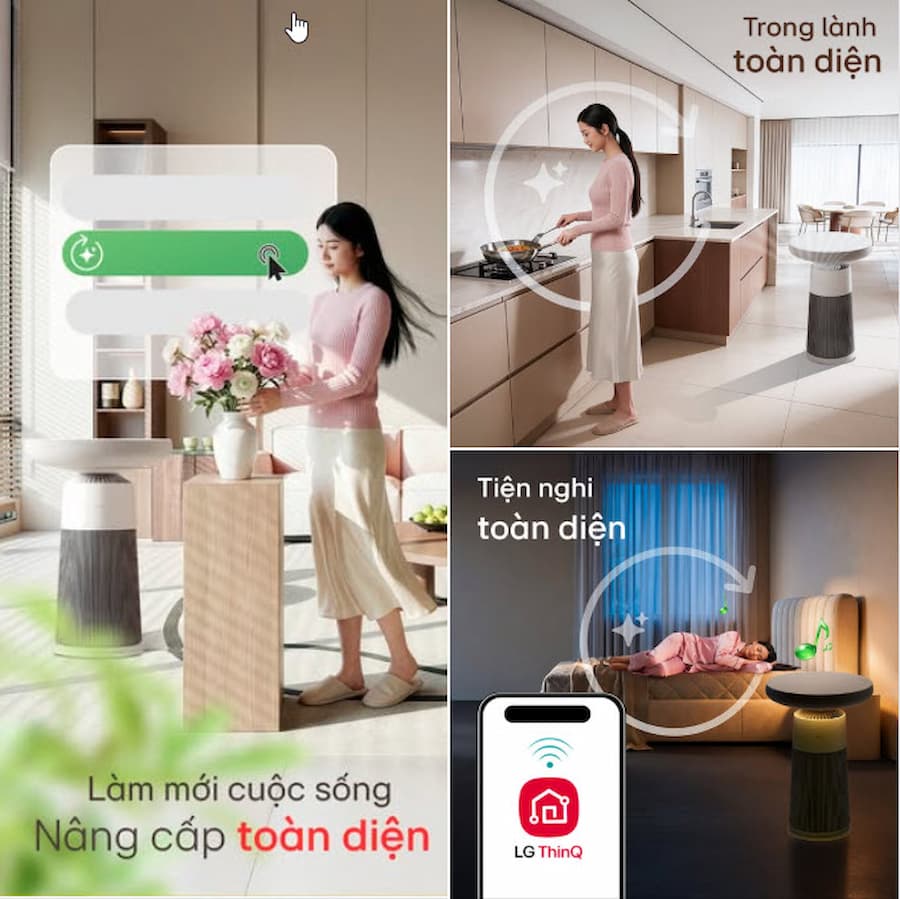 Kết nối LG ThinQ: Điều khiển từ xa qua điện thoại, theo dõi chất lượng không khí theo thời gian thực và tùy chỉnh chế độ đèn/âm thanh.