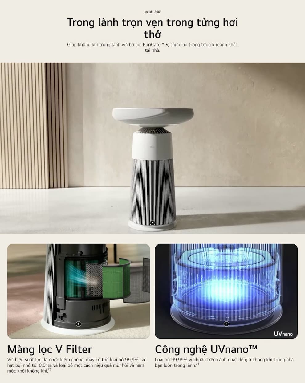 Sản phẩm LG PuriCare™ Aerospeaker AS20GSHU0 thừa hưởng công nghệ lọc 360 độ đặc trưng của dòng PuriCare: