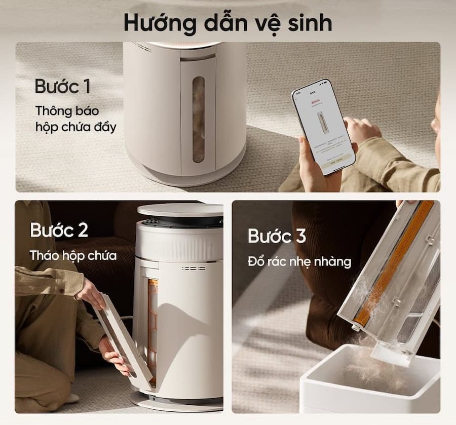 Nếu bạn nuôi mèo hoặc chó lông dài, hãy chú ý đổ hộp chứa lông (0.46L) định kỳ khi máy báo đầy.