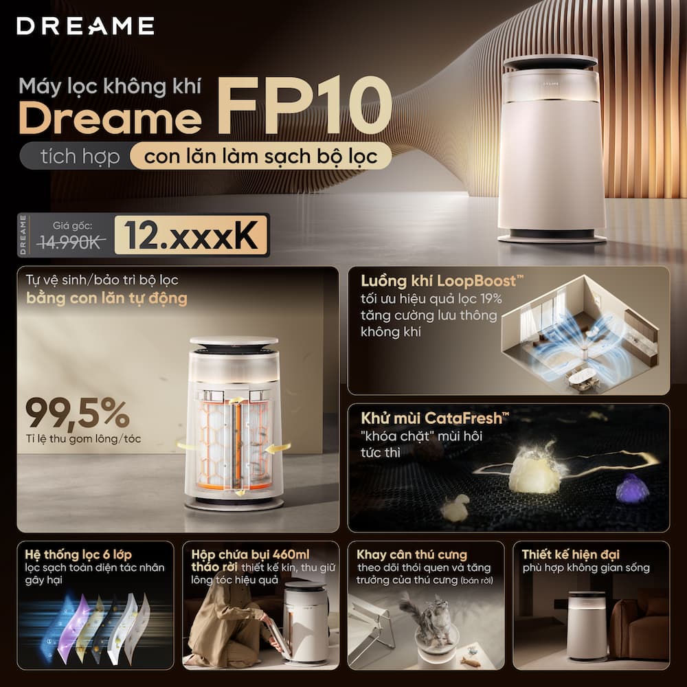 -41%Dreame FP10 là giải pháp làm sạch không khí tiên tiến, đặc biệt tối ưu cho các gia đình nuôi thú cưng nhờ khả năng xử lý lông bay lơ lửng và mùi hôi đặc thù. Máy lọc không khí Dreame FP10 mang đến giải pháp làm sạch không khí toàn diện với hệ thống lọc sâu 6 lớp, tự động điều chỉnh tần suất làm sạch theo chất lượng không khí trong nhà và đặc biệt tự làm sạch, không cần bảo trì. Vận hành thông minh, bảo vệ không gian sống luôn trong lành mỗi ngày. Muốn con thở khỏe từng nhịp bằng một chiếc máy lọc không khí… lọc yếu dần đều! Bạn có đang thực sự bảo vệ sức khỏe con, hay chỉ là cảm giác an tâm "ảo"? Duy trì hiệu suất lọc mọi thời điểm, Dreame FP10 là giải pháp toàn diện để cả nhà thở sạch 24/7 với chất lượng không khí "100 điểm". Con thở khỏe, hạnh phúc. Ba mẹ an tâm thực sự! Máy lọc không khí Dreame FP10 chăm sóc từng nhịp thở của bé và cả nhà.