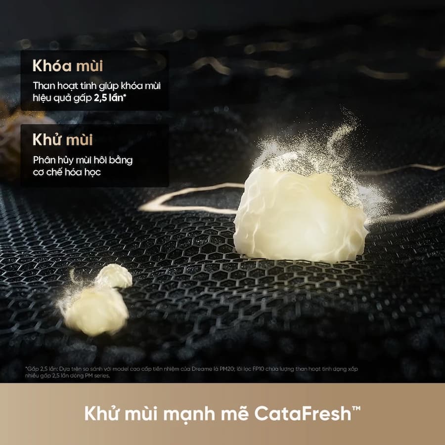 - Công thức khử mùi CataFresh™. Than hoạt tính dạng xốp được nâng cấp gấp 2,5 lần giúp khóa chặt mùi hôi, kết hợp cùng lớp kim loại chức năng có khả năng bẻ gãy liên kết phân tử mùi bằng phản ứng hóa học, giữ cho không gian sống luôn trong lành.