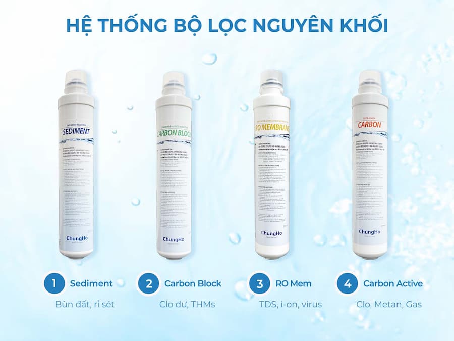 Lõi lọc nguyên khối Quick Change: Nhập khẩu từ Hàn Quốc, đảm bảo an toàn, vệ sinh, ngăn ngừa vi khuẩn xâm nhập và dễ dàng thay thế mà không cần dụng cụ chuyên dụng. Đạt chứng nhận NSF/ANSI 58, 53, 42, 61.