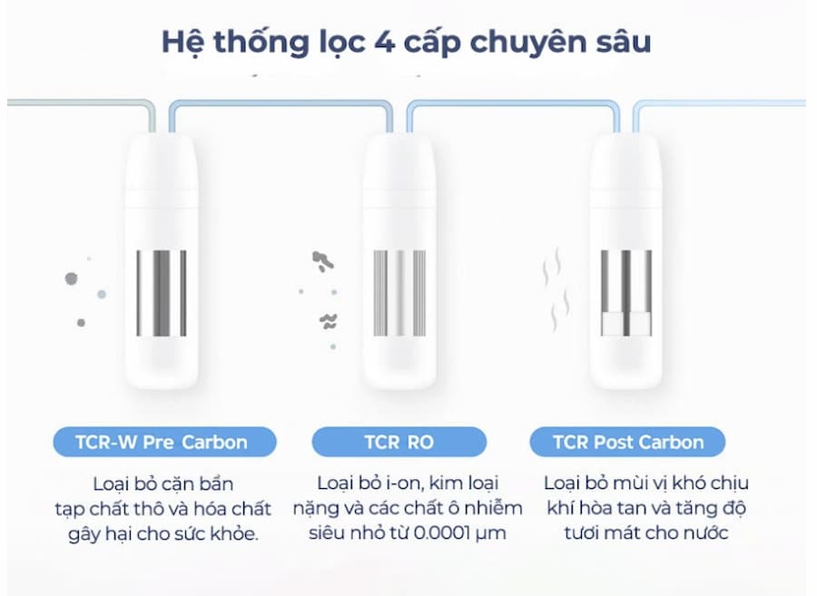 Bước 3: Màng lọc RO TCR (thay thế sau 24-36 tháng): Loại bỏ triệt để kim loại nặng, hóa chất hữu cơ, ion hòa tan, vi khuẩn, virus.