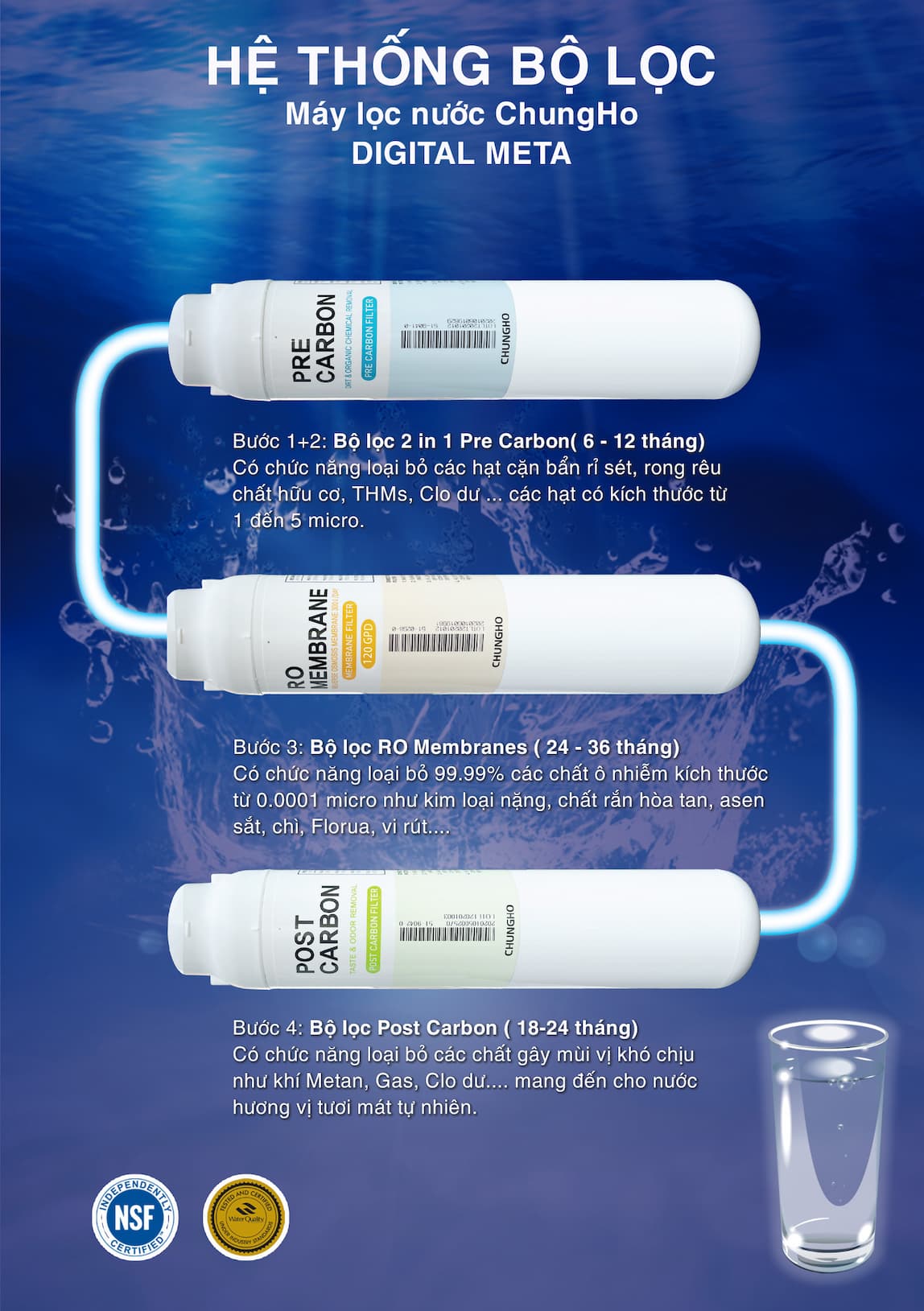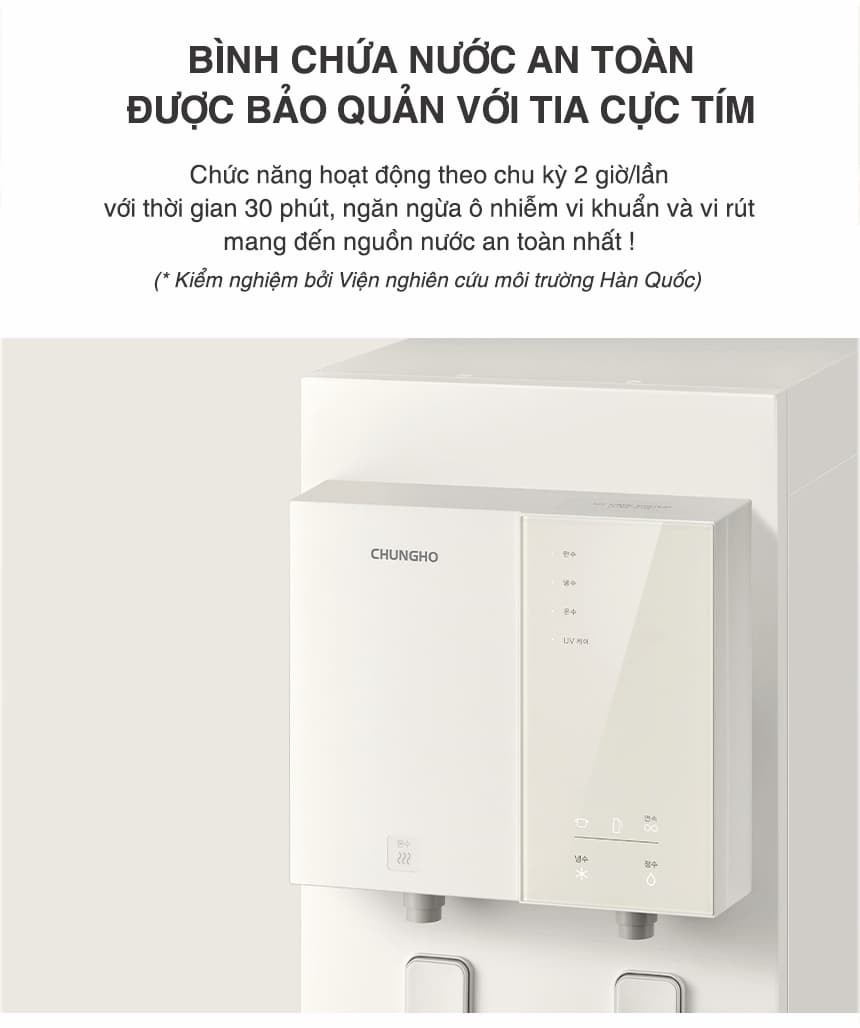 -19%Chungho là một trong những thương hiệu máy lọc nước hàng đầu tại Hàn Quốc, nổi tiếng về công nghệ và chất lượng sản phẩm. Máy lọc nước Chungho DIGITAL META (GWP-45S9P510M) là một sản phẩm cao cấp của Chungho, nổi bật với công nghệ lọc RO và nhiều tính năng thông minh. Với công nghệ lọc RO tiên tiến của Mỹ, kết hợp diệt khuẩn UV-LED, hệ thống này đảm bảo loại bỏ 99.99% vi khuẩn, virus, kim loại nặng, hóa chất độc hại và các tạp chất siêu nhỏ, mang đến nguồn nước tinh khiết, an toàn để uống trực tiếp mà không cần đun sôi. Thiết kế sang trọng và hiện đại: Chungho DIGITAL META có kiểu dáng đứng, màu vàng be trang nhã, bảng điều khiển cảm ứng và vòi lấy nước điện tử, tạo điểm nhấn cao cấp cho không gian lắp đặt. Hệ thống tự làm sạch ACS giúp giữ vệ sinh cho máy và màng lọc, kéo dài tuổi thọ lõi lọc, đảm bảo nước luôn sạch. Tuần hoàn nước 24h (NWPW) tránh tình trạng nước đọng, cũ trong bình chứa, đảm bảo nước luôn tươi mới.