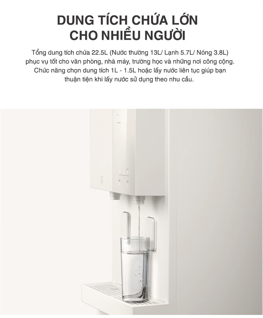 Dung tích bình chứa lớn: Tổng dung tích 22.5 lít (Nóng: 3.8L, Lạnh: 5.7L, Thường: 13L), phù hợp cho những nơi có lượng người sử dụng đông.
