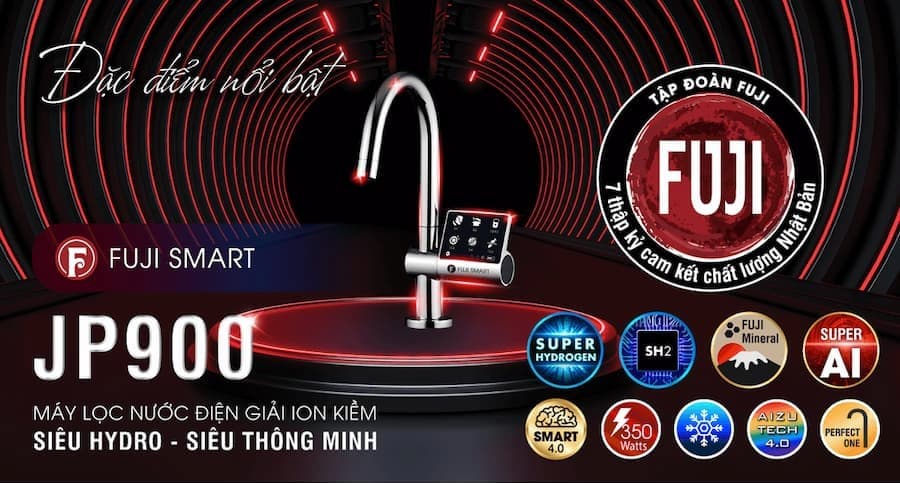 -25%Máy lọc nước điện giải iON kiềm Fuji Smart JP900 là kiệt tác cao cấp đến từ Nhật Bản, với thiết kế Perfect One 1 vòi độc đáo cùng tính năng tốt cho sức khỏe: tạo nước ion kiềm có nồng độ Hydro cao 1140ppb; 9 loại nước chức năng với dải pH rộng từ 2.3 - 11.7; có nước ion kiềm mạnh và nước ion axit mạnh diệt hầu hết vi khuẩn... Fuji Smart JP900 tích hợp khoáng quý tự nhiên từ nguồn đá khoáng núi lửa Fuji và sở hữu thiết kế Undersink thời thượng kết hợp cùng màn hình Super Led cảm ứng thông minh. Máy lọc nước ion kiềm Fuji Smart JP900 được trang bị 2 buồng điện phân kép, 7 tấm điện cực Smart 4.0 và Chip SH2. Dưới đây là một số thông tin chi tiết về sản phẩm này: