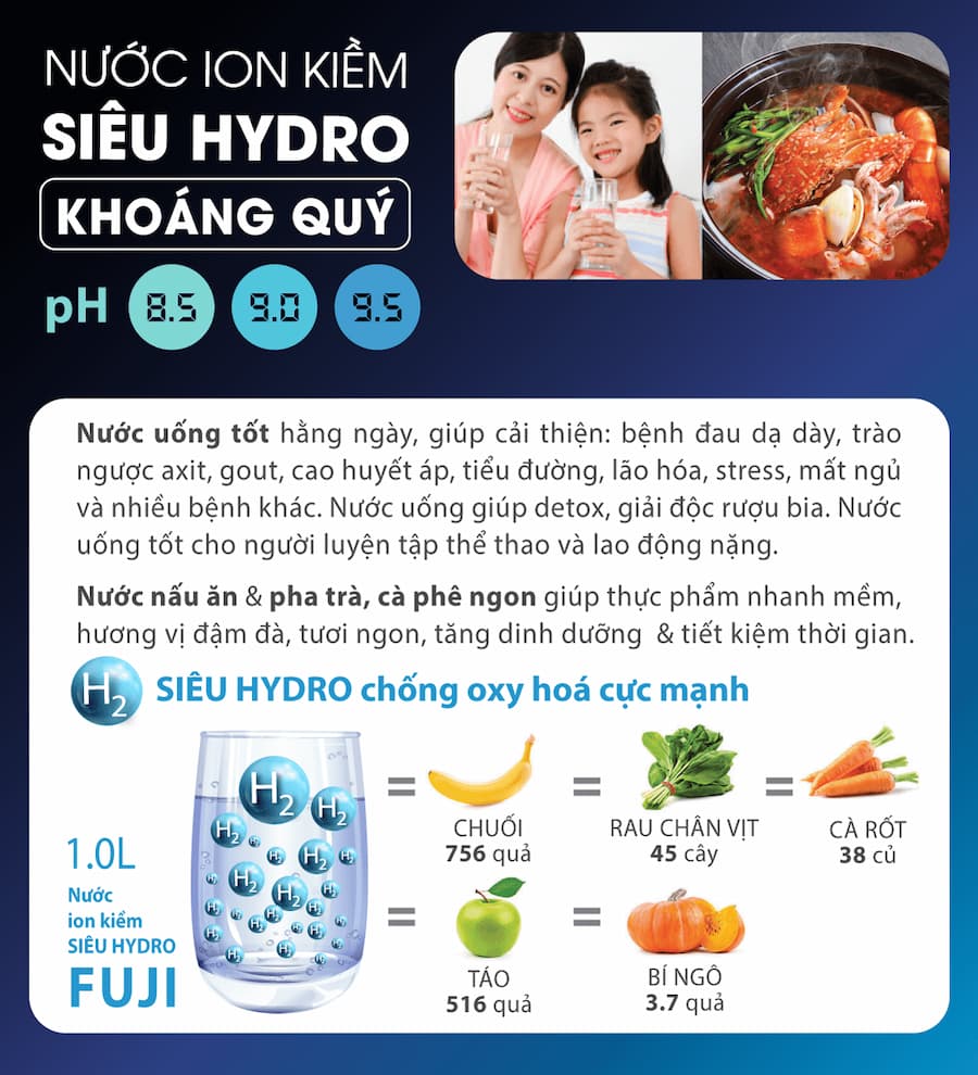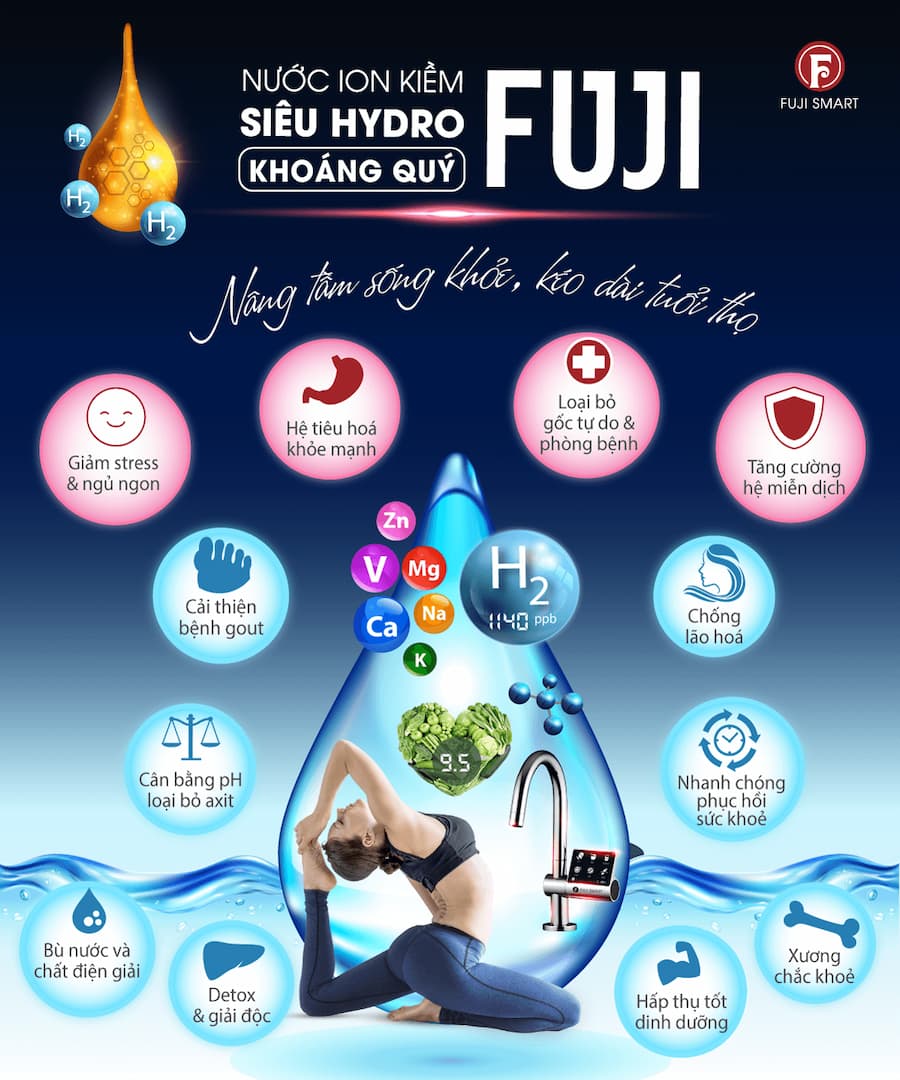 Hỗ trợ trung hòa axit dư thừa: Nước iON kiềm từ Fuji Smart JP900 có tính kiềm tự nhiên (pH 8.5 - 9.5), giúp trung hòa lượng axit dư thừa trong cơ thể do chế độ ăn uống và sinh hoạt hiện đại gây ra. Điều này giúp cân bằng pH nội môi, hỗ trợ ngăn ngừa và cải thiện các bệnh liên quan đến dư thừa axit như gout, đau dạ dày, trào ngược axit.