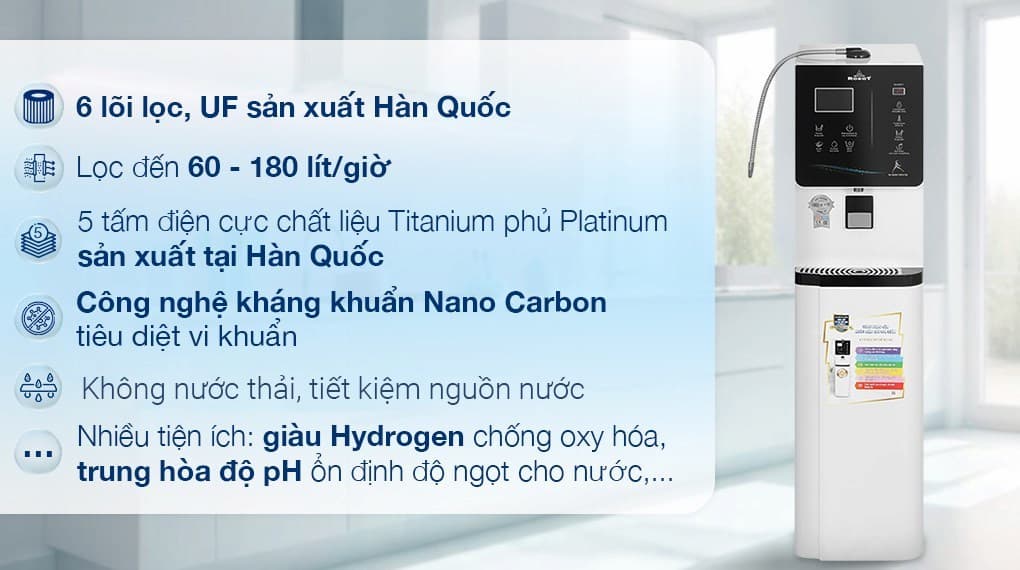 Vòi inox 360° + Bộ điện phân sản xuất tại Hàn Quốc Màng lọc ION Sumitomo - Nhật Bản Bộ lọc sản xuất tại Hàn Quốc + tích hợp lõi lọc Nano Carbon Robot Sản phẩm được lắp ráp tại Nhà Máy Robot - Việt Nam |