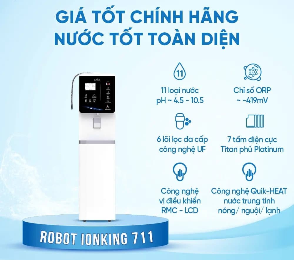 -20%Máy lọc nước điện giải ion kiềm Robot ionKing 711 là một mẫu máy lọc nước cao cấp, với nhiều tính năng nổi bật và là dòng máy tủ đứng đầu tiên trên thế giới tích hợp cả 3 chức năng nóng, nguội, lạnh 🌡️. Robot ionKing 711 được trang bị 7 tấm điện cực, tạo 11 loại nước chức năng là một lựa chọn đáng cân nhắc cho những người quan tâm đến sức khỏe, mong muốn sử dụng nguồn nước sạch, an toàn để nâng cấp chất lượng cuộc sống hàng ngày.