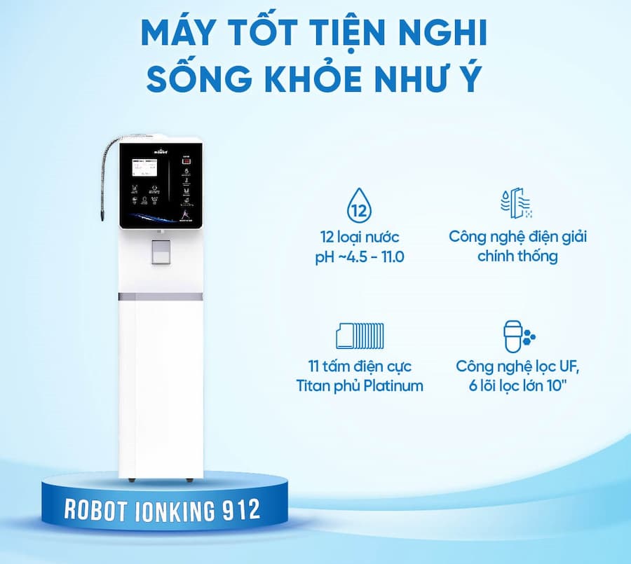 -23%Máy lọc nước điện giải ion kiềm Robot ionKing 912 là một sản phẩm cao cấp, hiện đại, được sản xuất tại Việt Nam với linh kiện nhập khẩu từ Hàn Quốc. Robot ionKing 912 tạo ra 12 loại nước khác nhau, từ nước ion kiềm (pH 8.5-11.0) để uống, nấu ăn, đến nước ion axit (pH 4.5-5.5) để làm đẹp và vệ sinh, cùng với nước trung tính. Tích hợp Nóng - Lạnh: có 3 chế độ nước Nóng (lên đến 99°C), Nguội và Lạnh, rất tiện lợi cho mọi nhu cầu sinh hoạt. Chỉ số Hydrogen & ORP cao: Nước được tạo ra có nồng độ Hydrogen cao (khoảng 1720 ppb) và chỉ số chống oxy hóa (ORP) thấp (khoảng -859 mV), tốt cho sức khỏe. Máy lọc nước ion kiềm Robot ionKing 912 sử dụng 9 tấm điện cực lớn bằng Titanium phủ Platinum của Hàn Quốc, kết hợp công nghệ điện phân và công nghệ lọc UF, đảm bảo chất lượng nước tốt nhất. Thiết kế dạng tủ đứng sang trọng, màn hình cảm ứng LCD, có giọng nói tiếng Việt, đặc biệt không tạo nước thải, giúp tiết kiệm nước tối đa.