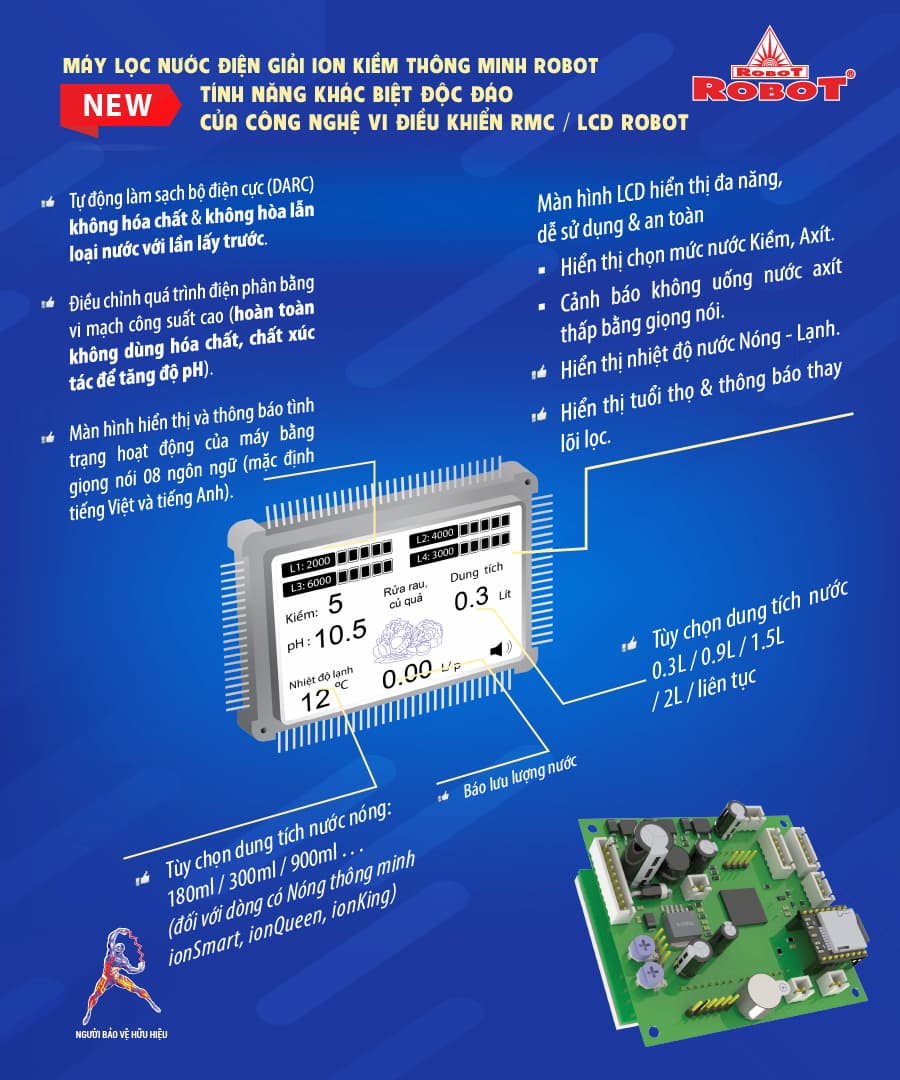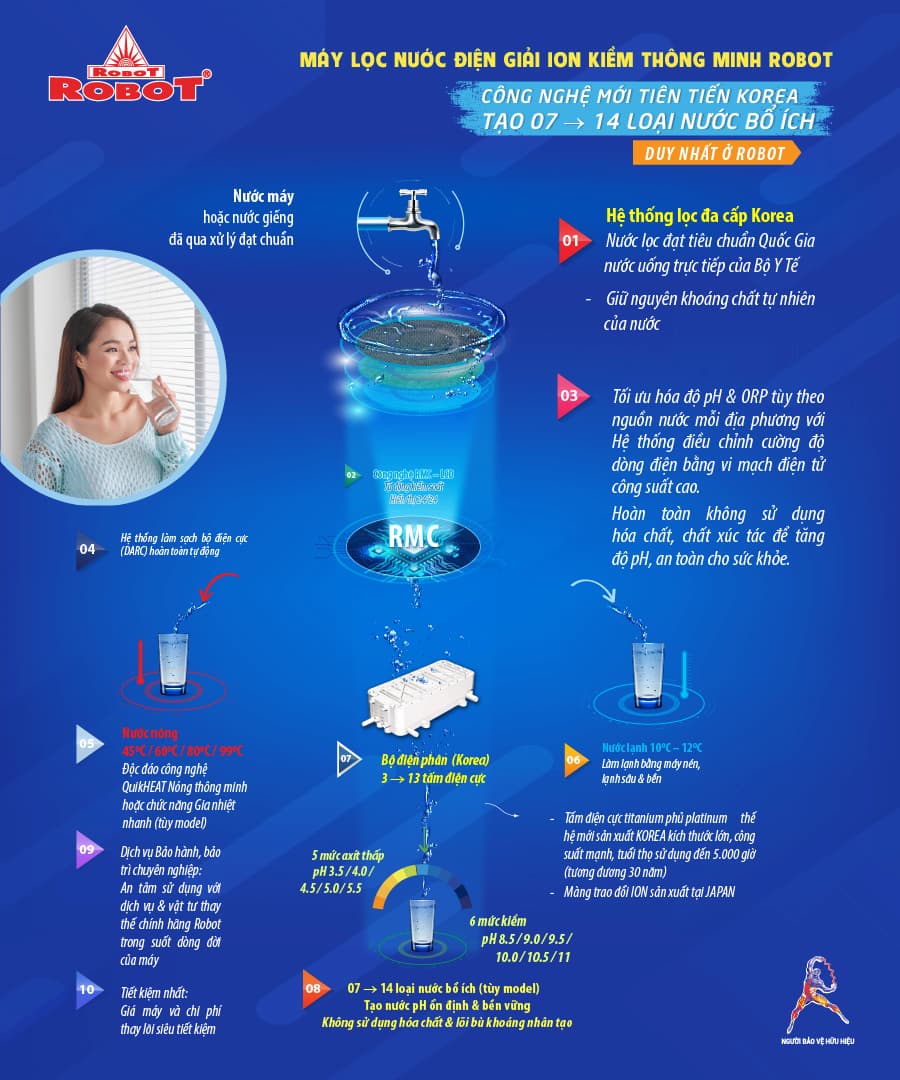 Công nghệ RMC: Công nghệ vi điều khiển RMC (Robot Micro Controller) độc quyền của Robot, giúp điều chỉnh cường độ điện phân để tạo ra chất lượng nước tốt nhất.