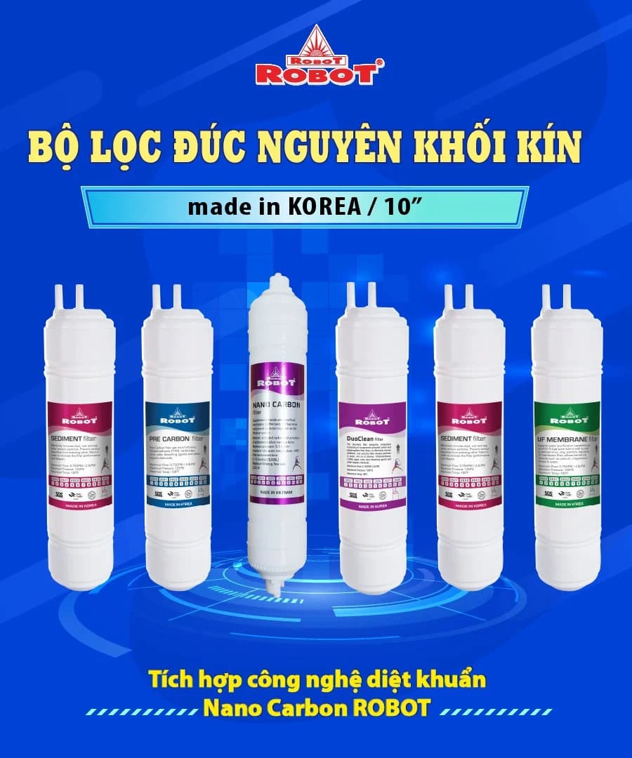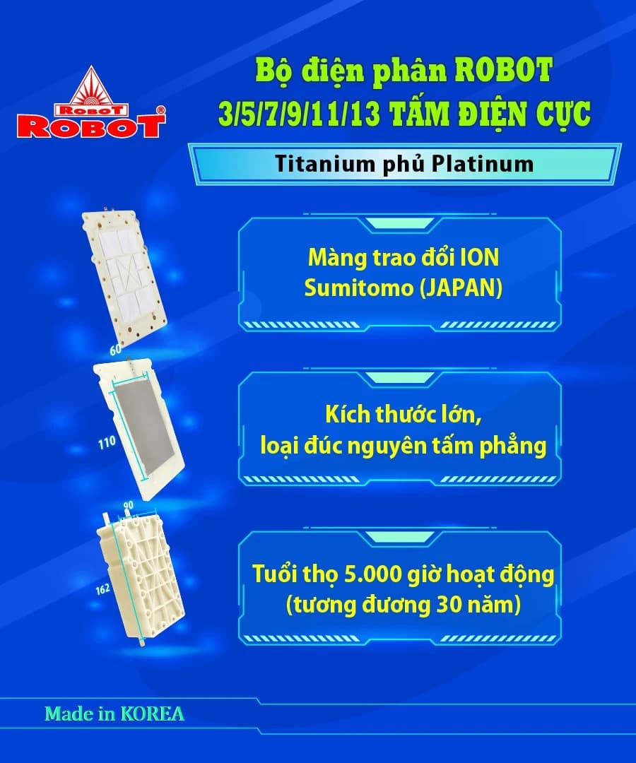 Vòi inox 360° + Bộ điện phân sản xuất tại Hàn Quốc Màng lọc ION Sumitomo - Nhật Bản Bộ lọc sản xuất tại Hàn Quốc + tích hợp lõi lọc Nano Carbon Robot Sản phẩm được lắp ráp tại Nhà Máy Robot - Việt Nam |