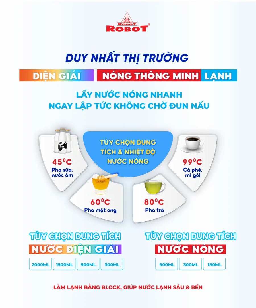 Tích hợp 3 chế độ Nóng - Nguội - Lạnh: Đây là điểm đặc biệt của dòng Robot ionKing, giúp người dùng có thể lấy nước nóng để pha trà, cà phê, pha sữa, hoặc nước lạnh để giải khát một cách tiện lợi.