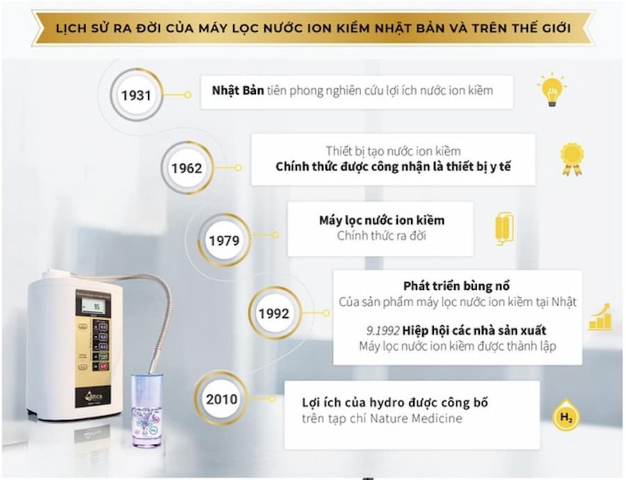 | Chế độ nước | Ion kiềm giàu Hydro (3 mức: 8.5 - 9.0 - 9.5), trung tính (1 mức), axit (1 mức: 5.5) |