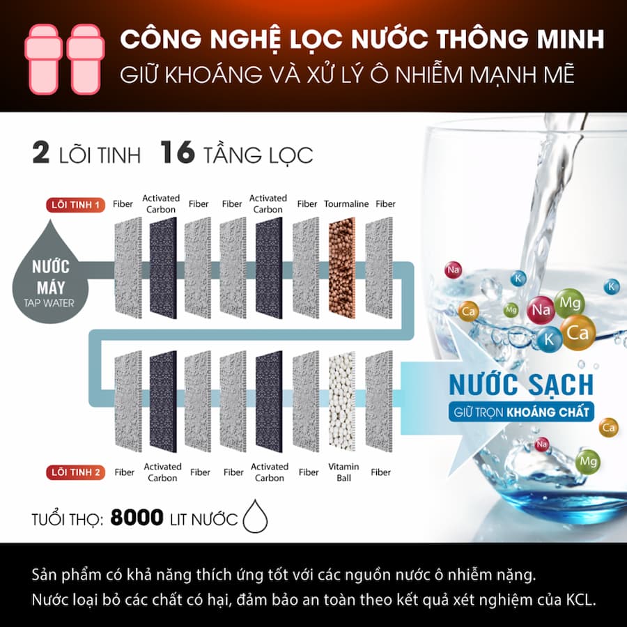 Nhiều tầng lọc: Hệ thống lọc gồm 2 lõi với tổng cộng 16 tầng lọc, giúp loại bỏ các tạp chất, vi khuẩn, vi rút, clo dư và các hóa chất độc hại trong nước.