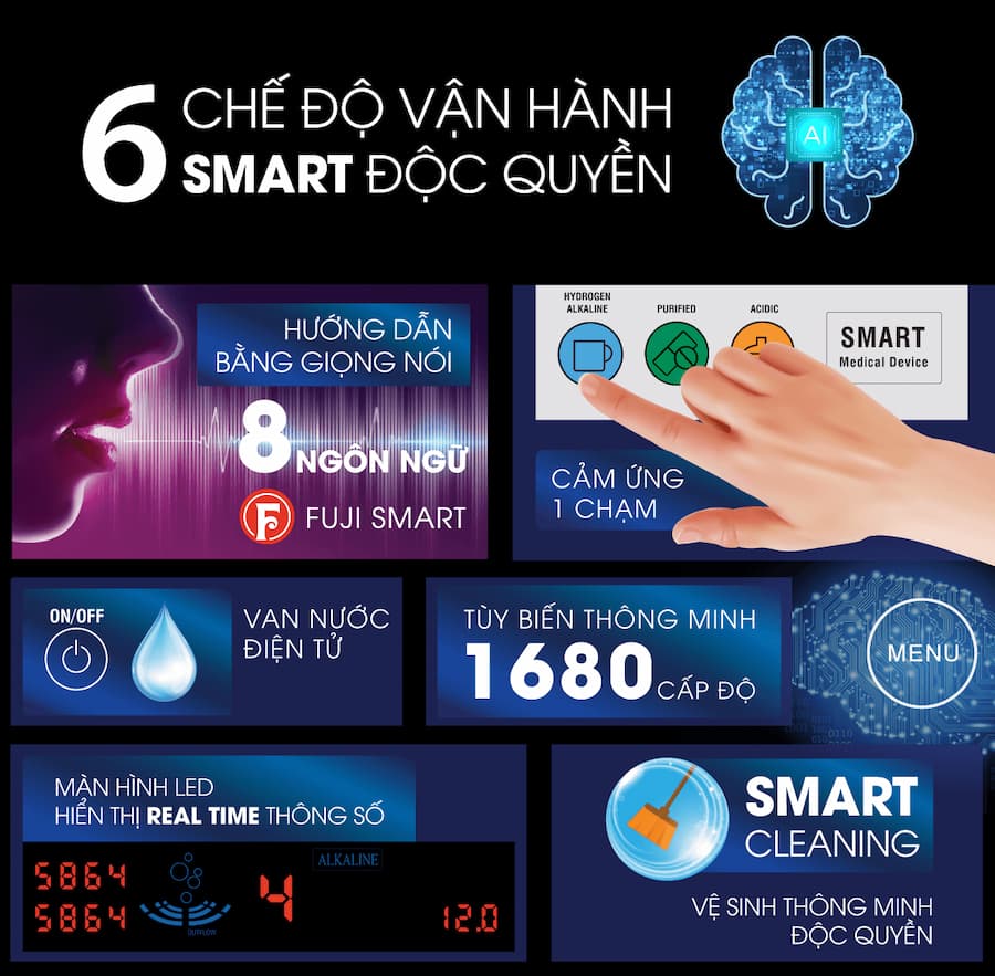 Công nghệ thông minh: Máy tích hợp công nghệ AI 4.0 và chip SH2, giúp tự động điều chỉnh và tối ưu hóa quá trình điện phân, phù hợp với nhiều nguồn nước đầu vào, kể cả những nguồn nước phức tạp.