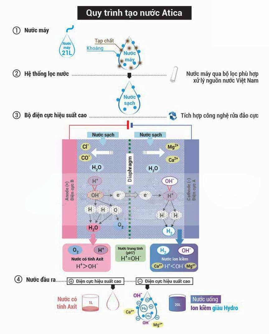 Chống oxy hóa, loại bỏ gốc tự do: Nước ion kiềm Atica Eco được sản xuất bằng công nghệ điện phân 2 lần, tạo ra hàm lượng Hydro hòa tan cao (lên đến 545 ppb). Hydro là một chất chống oxy hóa mạnh, giúp trung hòa các gốc tự do có hại trong cơ thể. Các gốc tự do là nguyên nhân chính gây ra quá trình lão hóa và nhiều bệnh tật nguy hiểm như ung thư, tiểu đường, tim mạch...
