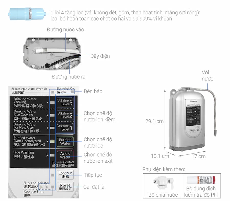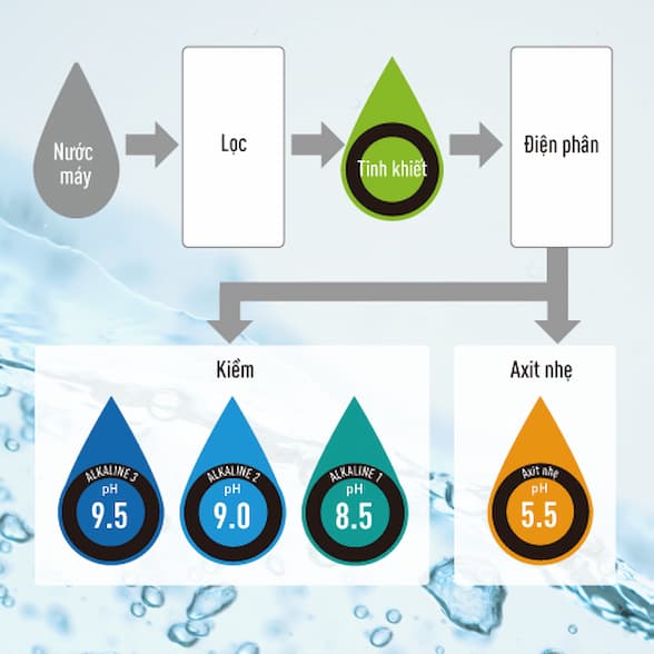 | Chọn khả năng điện phân | 5 mức (Kiềm: 3 mức; tinh khiết, axit nhẹ: 1 mức) | ||
