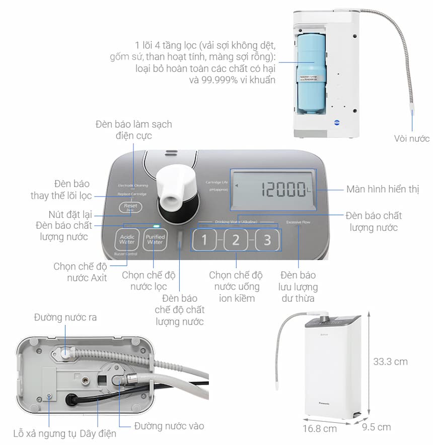 Tuổi thọ: Lõi lọc có công suất 12.000 lít, tương đương với việc sử dụng khoảng 1 năm. Tấm điện cực có tuổi thọ cao, khoảng 10-15 năm.
