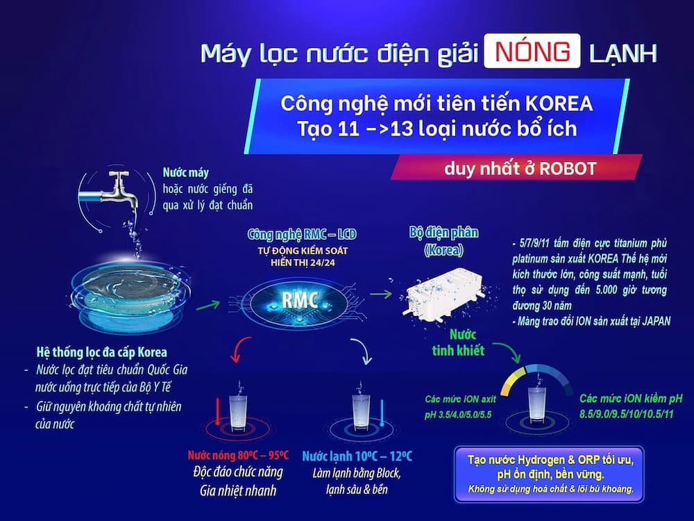 Tích hợp Nóng - Lạnh: Đây là tính năng tiện lợi độc đáo của máy, giúp người dùng có thể lấy nước nóng (tùy chỉnh 45°C, 60°C, 80°C, 99°C) và nước lạnh (10°C - 12°C) trực tiếp từ máy, không cần đun sôi hay làm lạnh bằng tủ lạnh.